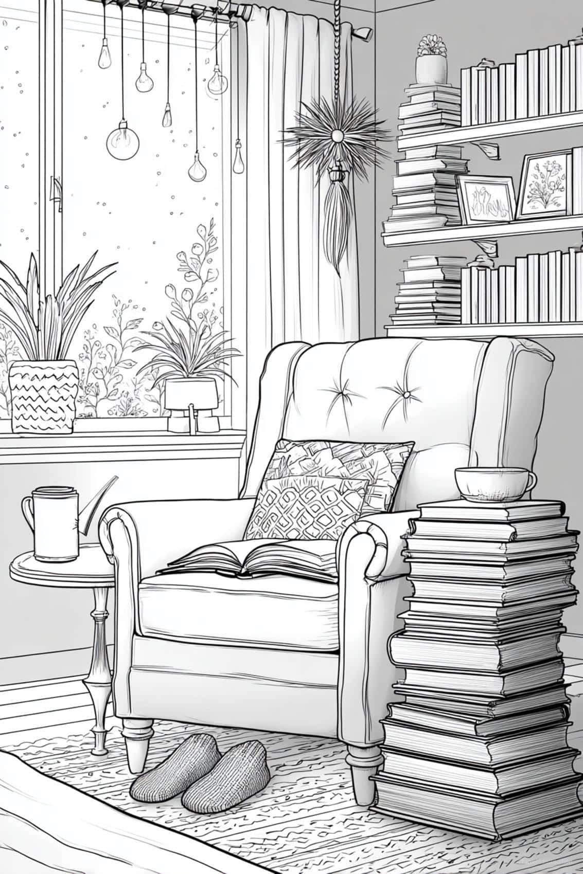 Every cozy bedroom deserves a little corner for reading, where you can curl up with a good book and let your mind wander. These coloring pages feature inviting reading nooks for those who love to get lost in stories or imagine new ones.