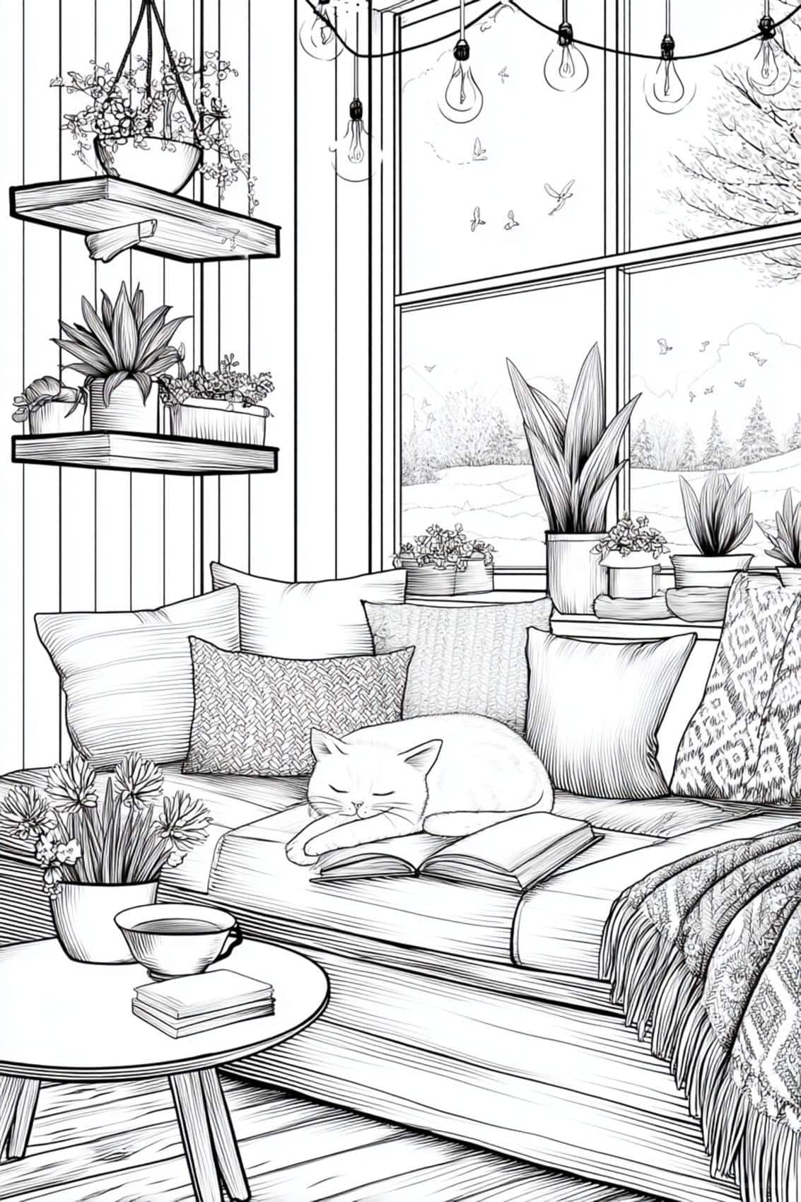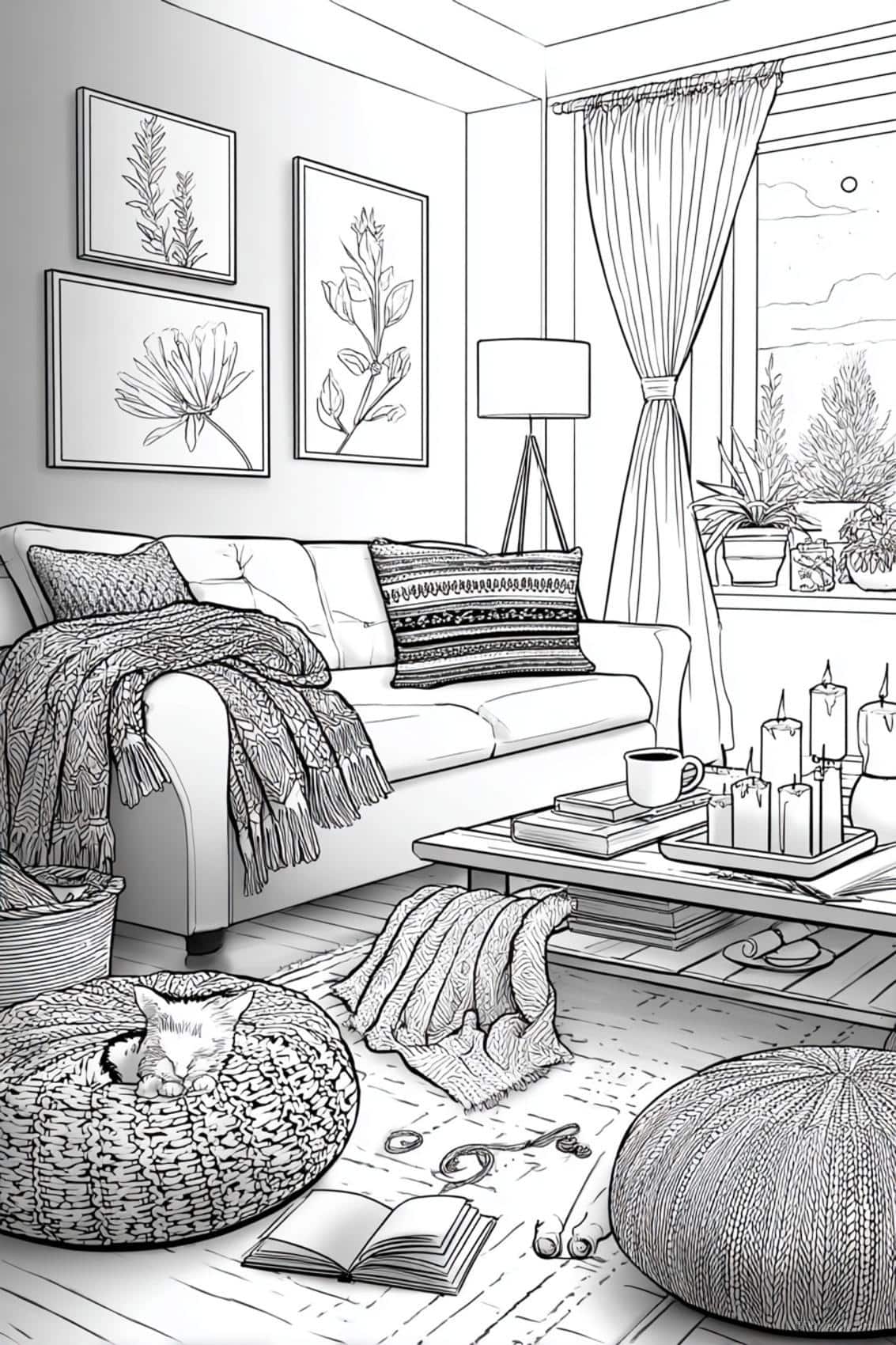 Nothing says home quite like a comfortable living room, complete with cushy sofas, fluffy pillows, and a warm throw blanket. As you color these scenes, picture yourself curling up with a good book or sharing laughter with family at the end of a long day.