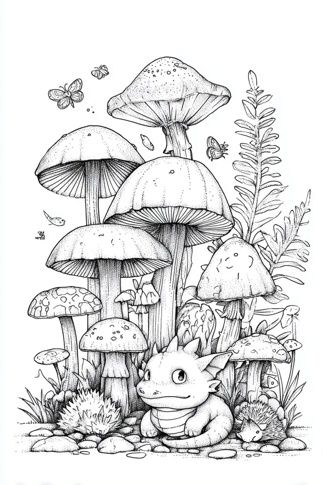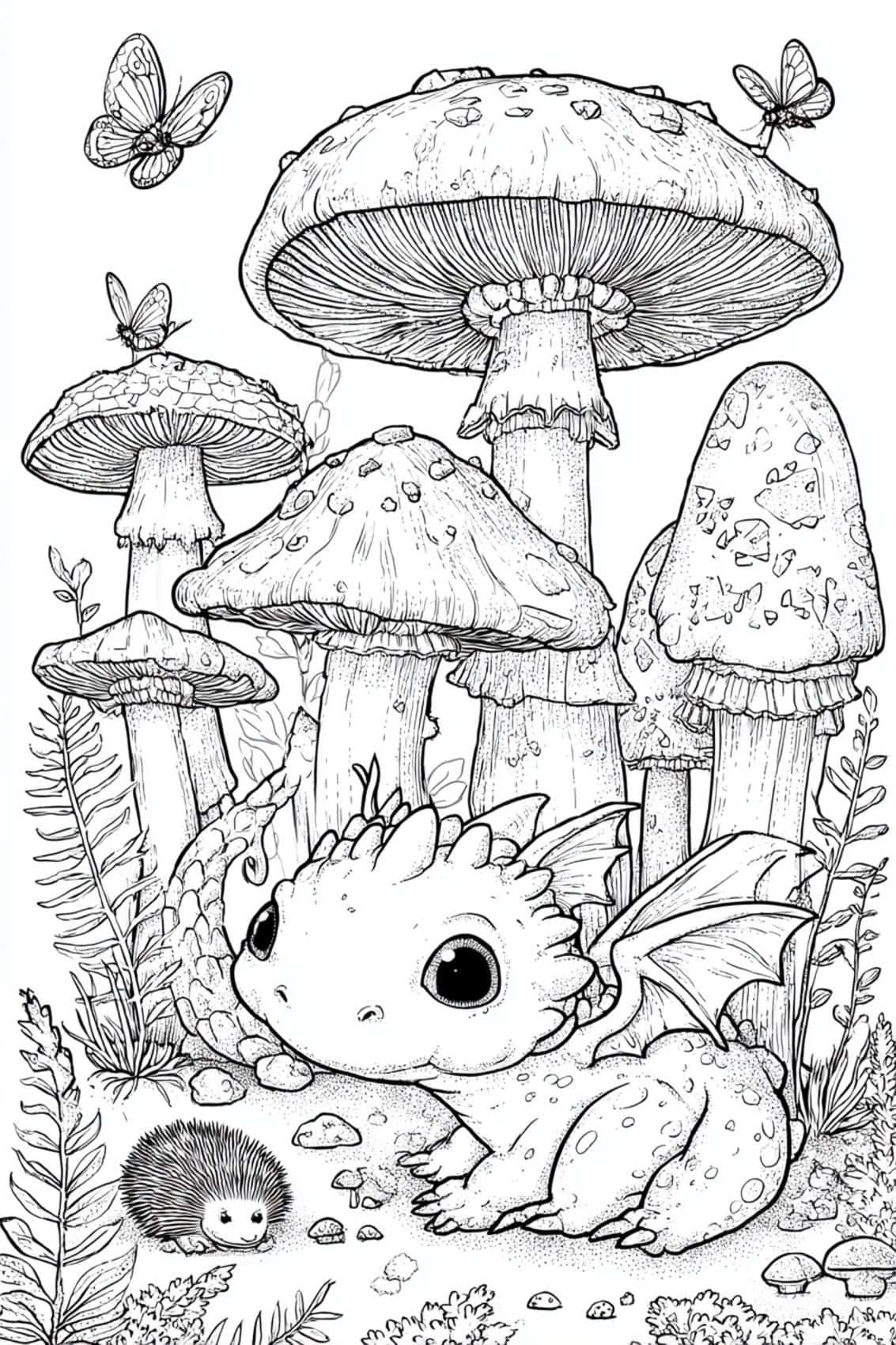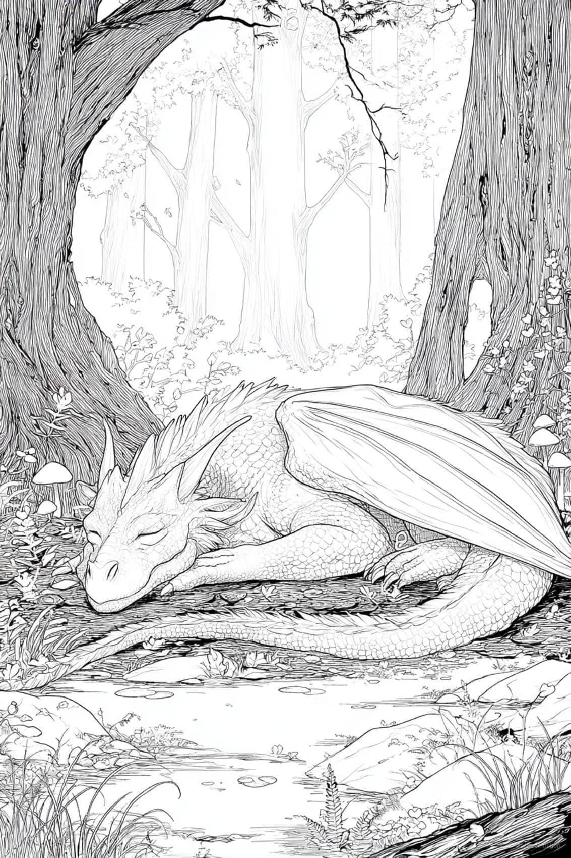 Let your imagination wander with these enchanting coloring pages, where a gentle dragon rests under a magical tree surrounded by glowing mushrooms and intricate forest details. Scenes like this remind me why I adore mythical coloring pages—they’re packed with hidden wonders to discover as you color.
