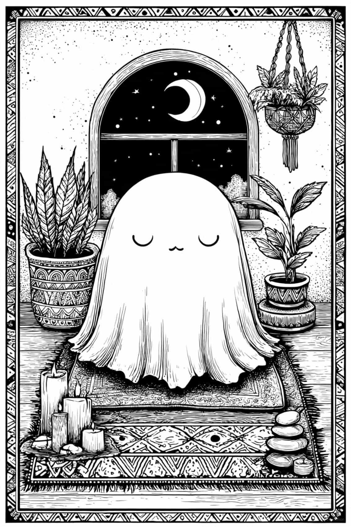 Sometimes even spirits need a moment to breathe. Here, a serene ghost drifts into meditation, radiating quiet balance and mindful stillness. This soothing page invites you to slow down, unwind, and color your way into a more centered state of mind — perfect for creating your own little oasis of peace.