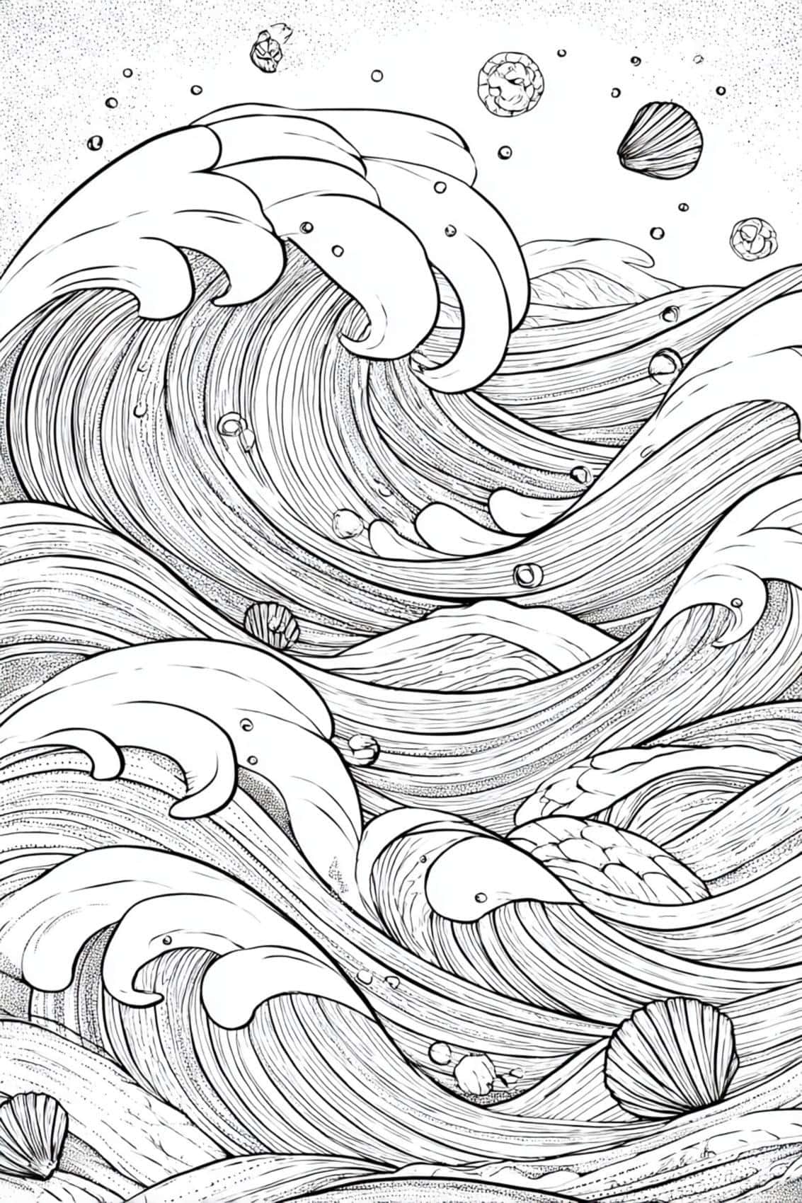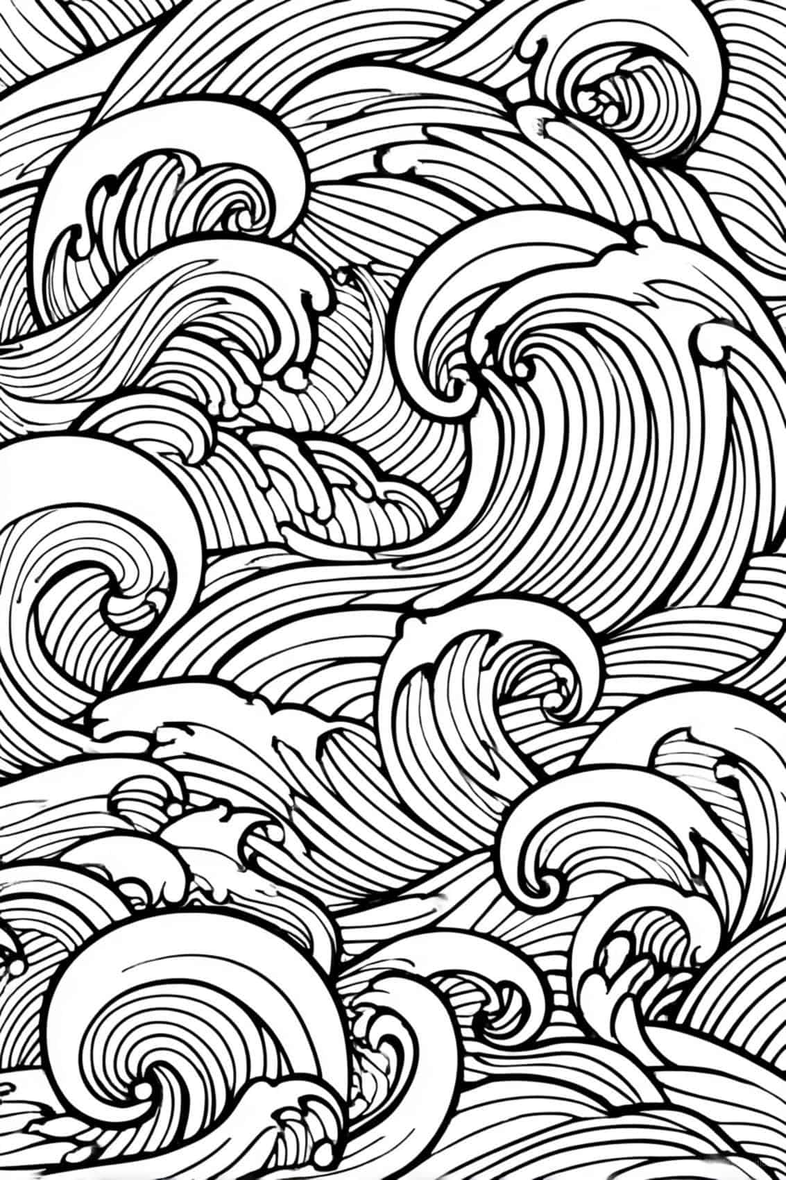 Flowing waves and mandala patterns intertwine in a soothing rhythm, creating a design that guides your mind gently toward calm. The repeating curves and spirals draw you into a peaceful state where each line feels like a quiet breath, and each section invites slow, mindful coloring. This harmonious blend of ocean-inspired movement and mandala symmetry offers a relaxing escape — perfect for dissolving stress, restoring balance, and bringing a sense of serenity with every stroke.